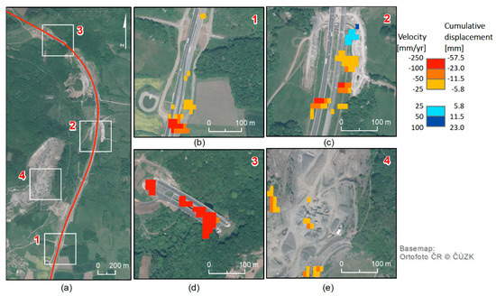 (a) Overview of the four sites with detected subsidence: 1: Area of highway embankment between Ječky Bridge and Dobkovičky Bridge; 2: Prackovice Bridge; 3: Area between two highway tunnels (“Prackovice” and “Radejčín”); 4: Dobkovičky quarry. (b–e) Cumulative vertical displacement (mm) during the given period from 22 February 2017 to 17 May 2017 and the recalculated subsidence/uplift velocity (mm/year) obtained by using single-pair DInSAR.