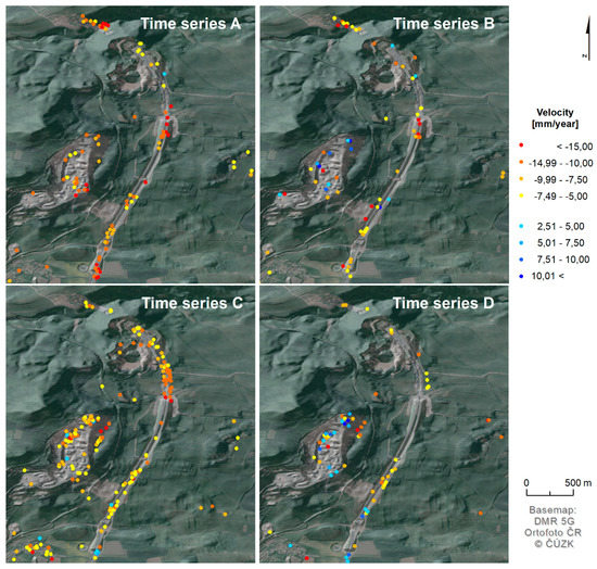 Four maps of surface deformation velocity represent the basic results of PSI analysis for each time series (Figure 10).