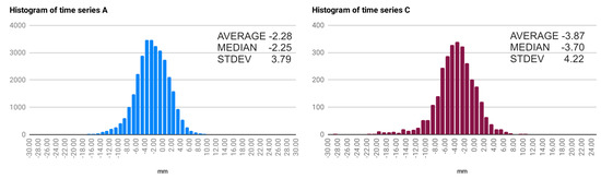 As can be seen in Figure 11, the histograms of time series A and C show that the whole dataset has a shift towards negative values with an average velocity of −2.28 and −3.87 mm/year, respectively. To make these values more comparable they were classified using standard deviation thresholding. Deformation values converted to standard deviation intervals allow the relative extreme values to be found independently of absolute numbers. Original velocity values and their standard deviation intervals are given in Table 2 and Table 3.