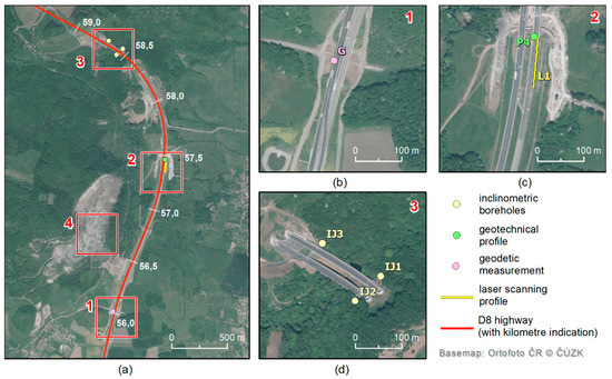 (a) Overview of the four sites with detected subsidence: 1: Area of the highway embankment between Ječky Bridge and Dobkovičky Bridge at km 55,700−56,000; 2: Prackovice Bridge, 57,300–57,500 km; 3: Area between two highway tunnels (“Prackovice” and “Radejčín”) at km 58,400; 4: Dobkovičky quarry. (b–d) Localization of in situ measurements in polygons 1–3: inclinometers (IJ1-3), laser scanning (L1), and geodetic measurements (G, P4).
