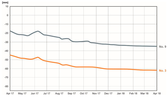 Due to extensive construction prior to opening the highway, this highway and its surroundings are very prone to vertical settling. In situ measurements in this part of the highway were made in an hour-interval using total station [59] in eight geotechnical profiles. One of them, P4, was chosen for validation (location of the profile, see Figures 12 and 15). Geotechnical profile P4 consists of nine points that are located at a very short distance (40 cm) from each other, therefore they are shown as a point on the map (Figure 12). Measurements taken at two points (No. 3 and No. 9) out of these nine points of profile P4 from April 2017 to April 2018 are plotted in a separate graph (Figure 14). Subsidence values measured in situ at point Nos. 3 and 9 in the P4 profile were 18 and 17 mm, respectively, between April 2017 and April 2018 (Figure 14).