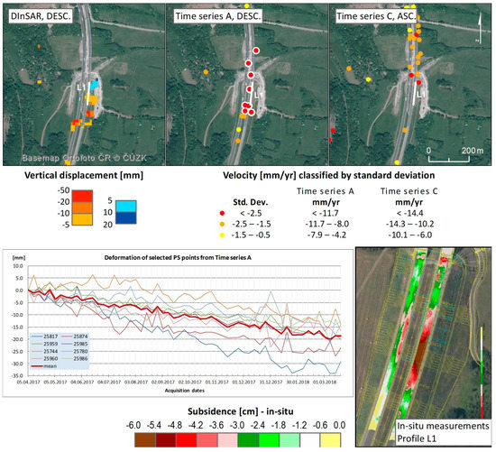 Combined outcomes of the methods used for detecting land subsidence/uplift in area no. 3. In order from the left: the single-pair DInSAR and the PSI results (time series A and C) together with a graph of the deformation of selected PS points from time series A, highlighted with white background on maps. Subsidence measured using laser scanning between December 2016 and May 2017 on profile L1 (Fuchs, 2017).