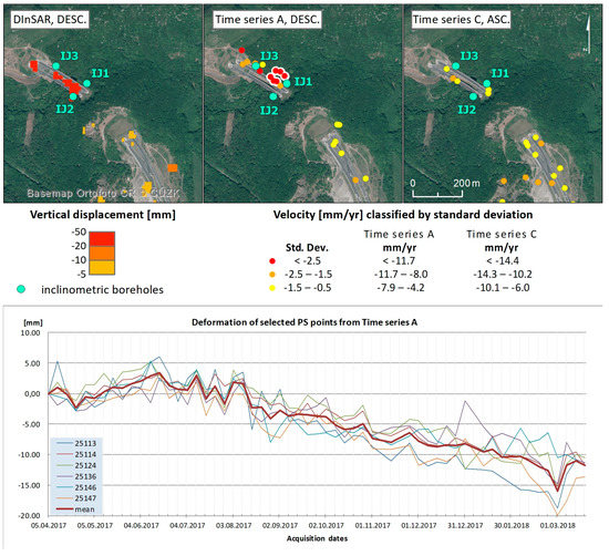 More detailed maps of time series A and C, where the PS points were classified using standard deviation thresholds, are presented in Figures 13, 15 and 16. In accordance with the single-pair DInSAR map (Figure 9) the four identical areas of subsidence were defined. The subsidence is more pronounced in the case of descending track results. In this case, viewing geometry influences the location of PSs, because of the eastward orientation of the slope on which the motorway is built. The Time series of the selected points (on maps highlighted with white backgrounds) are plotted in the graphs that complement the detailed maps (Figures 13, 15 and 16).