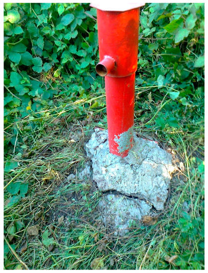 For polygon no. 3—the area connecting the Prackovice and Radejčín highway tunnels—single pair DinSAR indicated movements between 20 and 110 mm over a three-month period. PSI analysis indicated subsidence with average subsidence up to 15 mm in the descending geometry and 9 mm in the ascending geometry (Figure 16). However, due to the coherence issue, there were only three PS points for time series A (ascending geometry). The bridge’s pile foundation and slopes are monitored using borehole inclinometers (IJ1, IJ2, and IJ3, [60]) and these showed zero motion values in 2018. On the other hand, geodetic measurements [58] show subsidence of up to several centimeters for the valley surface. Such movements can be interpreted as a result of the volume changes in clay soils in the valley beneath the bridge. Due to rather dry weather conditions in 2017 and 2018, the clay soils were shrinking and losing their volume. The presence of soil compaction was also indicated by numerous shrinking cracks and subsequent exposed borehole heads in the valley (Figure 17).