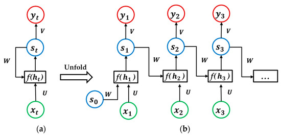 RNNs are neural networks specialized for processing sequential data. A standard RNN architecture is shown in Figure 3 ((b) is an expanded form of (a) on data sequences). The state of the network at each time point depends on both the current input and the previous information stored in the network. There are two types of RNN architectures, as follows: With output at each time point (many-to-many) or with output only at the last time point (many-to-one).