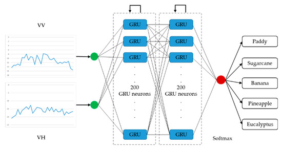 One-dimensional convolutional neural networks (1D CNNs) [24] and recurrent neural networks (RNNs) [25] have been shown to be effective deep learning methods for end-to-end time series classification problems [26,27]. Long short-term memory RNNs (LSTM RNNs) and gated recurrent unit RNNs (GRU RNNs) are variants of RNNs that solve the problem of gradient disappearance or explosion seen with an increasing time series [28,29]. Recently, some effort has been spent on exploiting 1D CNNs [2,30], LSTM RNNs [20,31,32,33], and GRU RNNs [20,33] for time series classification of crops. Zhong et al. [30] classified 13 summer crops in Yolo County, California, USA, by applying 1D CNNs to the Enhanced Vegetation Index (EVI) time series. Conversely, Kussul et al. [2] input time series of multiple spectral features into 1D CNNs. Ndikumana et al. [20] evaluated the potential of LSTM RNNs and GRU RNNs on Sentinel-1 remote sensing data.