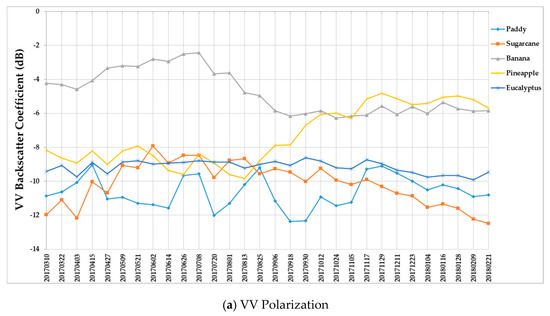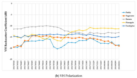 (ii) The backscatter coefficient of banana, which had the highest average backscatter values (VH + VV) (Figure 10), was always higher than that of other crop types before October. Thus, banana can be identified early.