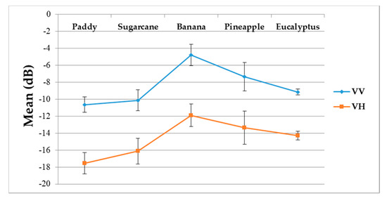 (i) The backscatter coefficient curve of eucalyptus (Figure 9) was almost horizontal, meaning its backscatter coefficient rarely changed throughout the growing season. In addition, compared to other crop types, eucalyptus had the smallest backscatter standard deviations (VH + VV) (Figure 10). Therefore, it exhibited significant temporal characteristics, which benefit its identification.