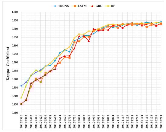 Figure 11 summarizes the evolution of average classification accuracies of five test sets as a function of time series using 1D CNNs (blue), LSTM RNNs (orange), GRU RNNs (red), and the RF (yellow). Each time point indicates the performance from five test sets on S1A imagery time series. The Kappa coefficient value given for each time point is the average from five repetitions.