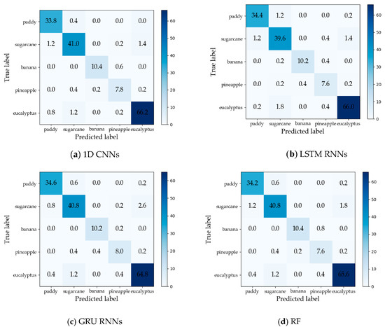 Furthermore, taking into account the summarized dates and accuracies summarized in Table 7, we can report that GRU RNNs had an advantage in classifying banana, the 1D CNN classifier was the only one that achieved an accuracy on pineapple above 0.900, and the RF had better early classification of the three other crop types (second-season paddy rice, sugarcane, and eucalyptus). However, on account of the growth periods of second-season paddy rice (early August to late November), sugarcane (mid-March to mid-February of the second year), and eucalyptus (4–6 years) (see Section 2.1), we believe that 1D CNNs, LSTM RNNs, and GRU RNNs achieved acceptable results for early classification of these crops.