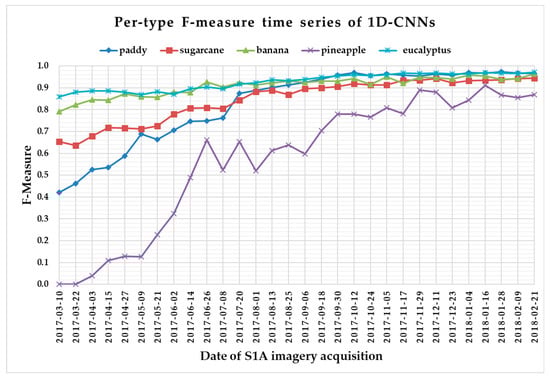First of all, we showed that with both the deep learning methods and the classical approach (the RF), good classification performance could be achieved with S1A SAR time series data. In order to find the early classification time series of different crop types, we reported the F-measure time series of each classifier for each crop type in Figure 13, Figure 14, Figure 15 and Figure 16 and summarized the first time points (and F-measure values) where the F-measure was above 0.900 in Table 6. We note that only 6 of 33 optical images acquired by Sentinel-2 [71] during the 2017 growing season in the AOI were not hindered by cloud cover. Therefore, good performance in early crop classification can be achieved because S1A SAR with a 12-day revisit period allows us to not only obtain data under any weather conditions, but also permits a precise temporal follow-up of crop growth.