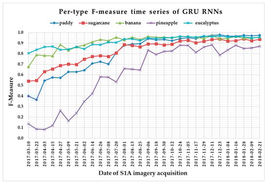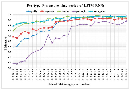(ii) All classifiers performed poorly on pineapple; it had the largest VH + VV backscatter standard deviation values (see Figure 10). This might be related to its year-round planting. Moreover, its F-measure time series values changed greatly with three deep learning methods, especially GRU RNNs, thus causing great volatility of its Kappa coefficient temporal profile. It is worth mentioning that this phenomenon is related to the long-term temporal dependence of GUR RNNs.