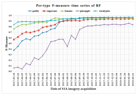 (i) The F-measure values of banana and eucalyptus changed slowly with all four methods, and were first above 0.900 between June and July 2017. To explain this behavior, we can refer to the temporal profiles of VH and VV presented in Figure 9. The dual-polarized backscatter coefficient values of banana were the highest before October, and therefore banana was easily identified at this stage. As discussed in Section 4.1, the temporal profiles of VH and VV of eucalyptus (with a tiny fluctuation and a small standard deviation value (see Figure 10) were more distinct than those of other crops.