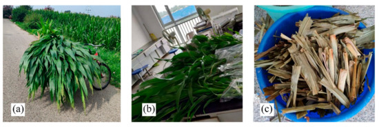 (a) Destructive ground sampling in the field; (b) measurements of the above-ground biomass (AGB) of fresh maize in the laboratory; (c) the AGB of dry maize after removing the moisture.
