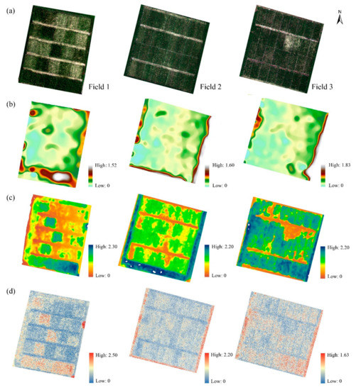 (a) The RGB maps of three experimental fields; the crop height raster data based on (b) the multiSPEC-4C, (c) the Micasense RedEdge-M, and (d) the LiDAR point clouds.