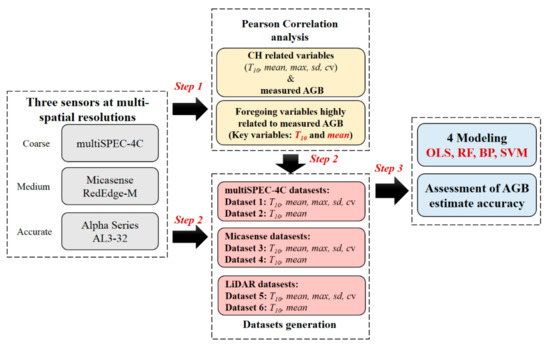The data processing flowchart for the estimation of maize AGB by 3D UAV-based information at multi-spatial resolutions is shown in Figure 6. This process included three steps.