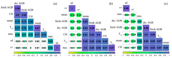 Firstly, to simplify the process used for estimating AGB in order to fulfill the requirements of agronomic application, we determined which key variables were highly correlated with AGB, using Pearson correlation coefficient analysis of the five statistical variables and the measurements of the fresh/dry AGB. These five variables included the mean value (mean), the mean value of the top 10% data (T10), standard deviation (sd), the coefficient of variation (cv), and the max value (max) of each plot, which were calculated from the CH datasets captured by the three sensors.