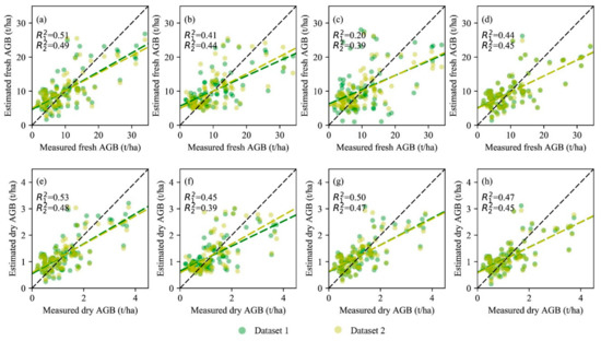 Comparisons of measured AGB and estimated AGB of maize via four methods based on A-Dataset 1 (green spots) and A-Dataset 2 (yellow spots) that were derived from the spectral data and fusion data, respectively: (a–d) OLS, RF, BP, and SVM for the AGB estimation of fresh maize; (e–h) OLS, RF, BP, and SVM for the AGB estimation of dry maize. R12 and R22 represent the coefficient of determination for a linear regression model between the measured and estimated AGB using A-Dataset 1 and A-Dataset 2, respectively.