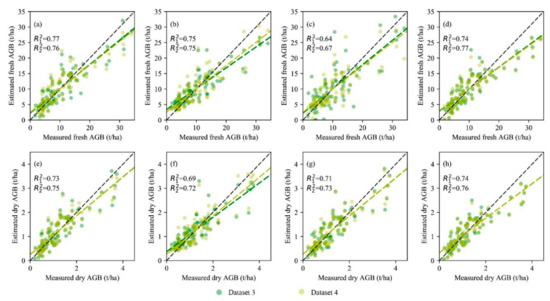Comparisons of measured AGB and estimated AGB of maize via the four methods based on Dataset 3 (green spots) and Dataset 4 (yellow spots), which were derived from the Micasense RedEdge-M SfM point clouds: (a–d) OLS, RF, BP, and SVM for the AGB estimation of fresh maize; (e–h) OLS, RF, BP, and SVM for the AGB estimation of dry maize. R12 and R22 represent the coefficient of determination for a linear regression model between the measured and estimated AGB using Datasets 3 and 4, respectively.