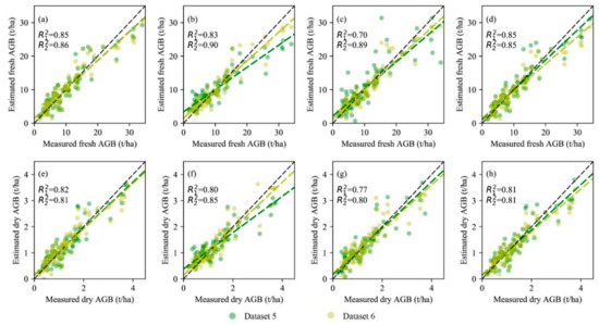 Comparisons of measured AGB and estimated AGB of maize via the four methods based on Dataset 5 (green spots) and Dataset 6 (yellow spots), which were derived from the LiDAR point clouds: (a–d) OLS, RF, BP, and SVM for the AGB estimation of fresh maize; (e–h) OLS, RF, BP, and SVM for the AGB estimation of dry maize. R12 and R22 represent the coefficient of determination for a linear regression model between the measured and estimated AGB using Datasets 5 and 6, respectively.