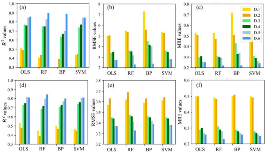 In this study, the values for R2, RMSE, and MRE for the OLS method were close to those of the RF and SVM machine learning methods, indicating that machine learning methods have no effective advantage over the traditional OLS method. Among the three machine learning methods, the performance of the BP method was poor when compared with the other methods, while RF and SVM performed better and were more robust.