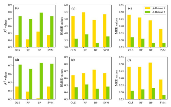 For further analyzing the effects of using 3D information on the AGB estimate, we conducted fresh/dry AGB estimates based on the Micasense RedEdge-M spectral datasets (A-Dataset 1) and the fusion datasets (fusion of the spectral data and Micasense RedEdge-M SfM point clouds, A-Dataset 2) using the OLS, RF, BP, and SVM methods. The scatters of the measured and estimated AGB are given in Figure 12. The performance of the estimation of the AGB from the two A-Datasets are compared in Figure 13.