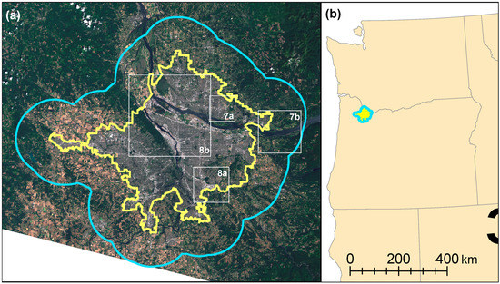 (a) Combined urban growth boundary (UGB) of the Portland, Oregon and Vancouver, Washington metropolitan areas (yellow line) and nearby rural lands outside the UGB within a 10 km buffer (blue line). Areas examined in Discussion (Figures 7 and 8) are indicated by white boxes. (b) Washington and Oregon states showing the location of the Portland-area UGB. Basemap (a) Landsat 8 red, green, blue (RGB) visual image (LANDSAT_PRODUCT_ID = “LC08_L1TP_046028_20140706_20170305_01_T1”). Basemap (b) state outlines from National Map. Basemap data obtained from U.S. Geological Survey.