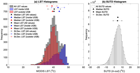(a) Comparison of histograms of MODIS LST throughout the study area (gray, n = 5672), inside the UGB (blue, n = 2057), and outside the UGB (red, n = 3615). The overlap of the semi-transparent blue and red histograms may appear purple. For each distribution, the median (triangles) and mean (squares) with one standard deviation error bars are shown by points at top. (b) Histogram of all possible SUTD values, as obtained by subtracting each LST value outside the UGB from each LST value inside (N = 7,436,055). Notice mean and median SUTD are slightly less than the mode, and the SUTD range extends below zero.