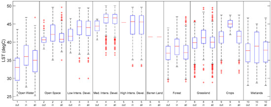 Comparison of LST by land cover (LC) class inside the UGB, outside the UGB, and overall. Bars are medians, boxes 25th and 75th percentiles (interquartile range, IQR), whiskers extend to 1.5 IQR, and + symbols are outliers. Each group of three plots is for one LC class, as labeled. Lower x-axis labels indicate if plot is based on data from inside UGB, outside UGB, or overall. Note, High Intensity Development outside the UGB and Barren Land inside and outside the UGB were represented by only very small numbers of pixels.