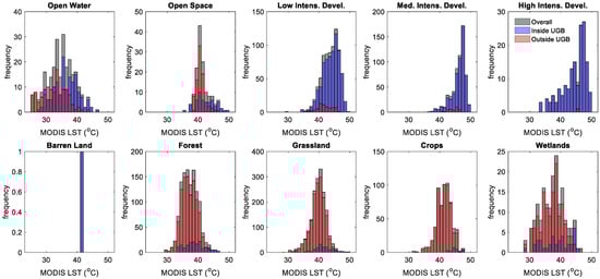 Comparisons of histograms of LST distributions by LC class for LC pixels occurring inside the UGB (blue), outside the UGB (red), and overall (gray). The overlaps of the semi-transparent blue and red histograms may appear purple. (See Supplement for histograms of % Impervious and % Canopy). Note, High Intensity Development outside the UGB and Barren Land inside and outside the UGB were represented by only very small numbers of pixels.