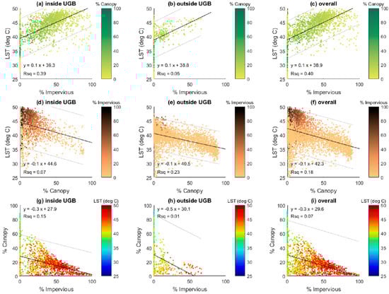 Scatterplots of relations among LST, percent impervious area, and percent canopy area, inside the UGB (a,d,g), outside the UGB (b,e,h), and overall (c,f,i). Lines of best fit in black and equations, 95% prediction intervals in gray.