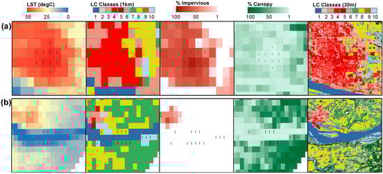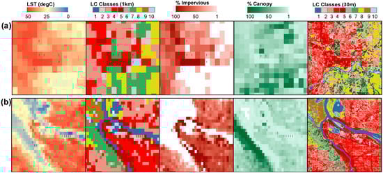 For the example warm MTA illustrated in Figure 8a, both the scale and intensity of hot- and cool-LC juxtapositions likely played a role in producing this result, as did the resolution of the data analyzed. Despite the prominent forested parks in the area, the great intensity of impervious area and LC juxtaposition and mixing below the resolution of the analysis permitted LST values to be elevated, even in the locations of the “typically cool,” dominantly Forest LC pixels. This subgrid effect likely explains the four more northern points of interest in Figure 8a (upper four black dots). At a 30 m native NLCD scale, these points were located on the boundaries between forested and intensely developed LCs (right-most panel, Figure 8a), but at the 1 km scale the locations were dominated by forest area. Their expression as warm MTAs are therefore likely due to the heat from the intensely developed lands overwhelming, at subgrid scale, the coolness of the spatially slightly more abundant forest area.