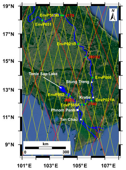 Map of the Lower Mekong River. The yellow and red lines indicate ground tracks of Envisat and Jason-2 altimetry, respectively. The white triangles indicate the in-situ gauges at Tan Chau, Kratie, and Stung Treng. The green triangles represent virtual stations. The white square is the reference location at Phnom Penh. (map data ©2019 Google).
