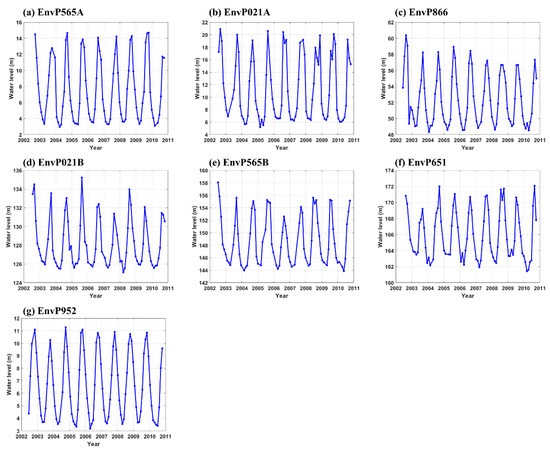 Envisat-derived water levels at seven virtual stations from 2002 to 2010.