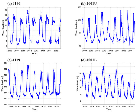 Base learners for ELQ, which can be obtained from an empirical relationship (i.e., a rating curve) between H and in-situ Q data, were generated. Time series of H obtained from Envisat and Jason-2 altimetry can be found in Figure 3 and Figure 4.