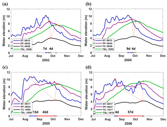 Time series plots of water levels from four in-situ stations in (a) 2003, (b) 2004, (c) 2005, and (d) 2006. The blue, purple, green, and black lines indicate water levels at Stung Treng (ST), Phnom Penh (PP), Tan Chau (TC), and Tonle Sap Lake (TSL), respectively. The red dots represent the peak flood dates whose ranges are August–September for ST and PP, and September–October for TC and TSL. The cross marks in the x-axis were added for visualization of the intervals of peak flood timing among the four stations.