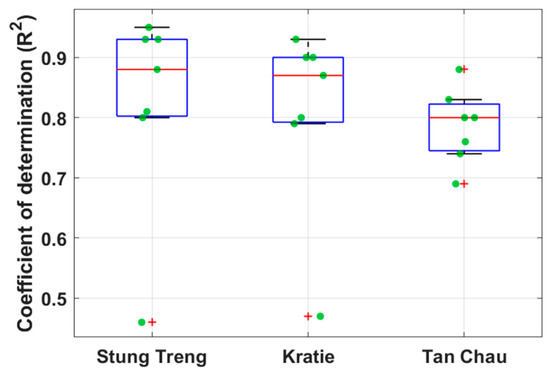 Ensemble pruning can also be performed before the integration process. Zhou [41] claimed that in order to obtain the best result in the ensemble process, the base learners that are less accurate should be excluded. Table 4 shows of the base learners at seven Envisat VSs with in-situ Q datasets from three different stations. As can be seen from Figure 6, that shows box plots of those ; outliers beyond the upper and lower whiskers were detected. The whisker values were set to half of the interquantile range (IQR), which corresponds to approximately 1.35 (where is the standard deviation) and 82.3% coverage of the normally distributed data [42]. Based on this analysis, we decided to prune less accurate base learners in the ensemble integration process. Therefore, EnvP952 and EnvP565B were excluded for Q estimation at Stung Treng and Kratie and at Tan Chau, respectively.
