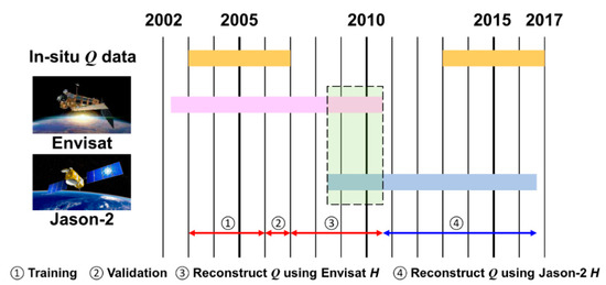 Secondly, the trained ELQ can reconstruct Q for the ungauged period (test period) from January 2007 to October 2010. However, since the Envisat satellite moved to a new orbit on October 22 2010, the trained ELQ cannot be used to reconstruct Q after that date. Therefore, it is required to use other radar altimetry data; in this case, the Jason-2 altimeter. In contrast to a previous study [26] adopting multi-mission radar altimetry data with a single rating curve, consideration of inter-mission biases is not required in this study. In other words, rating curves generated from different altimetry missions in [26] should consider the inter-mission biases because locations for estimating Q had to be close to VSs, and locations of VSs from several altimetry missions are not generally matched. On the other hand, since ELQ obtains a relationship between H variations at several different VSs and historical Q data at a specific station, ELQ does not need to consider inter-mission biases. In other words, several rating curves for the ELQ process with multi-mission altimetry data can be obtained not at a single location, but at several different distant locations. In addition, owing to the overlapping period between Envisat and Jason-2 altimetry missions, the training step for Jason-2 was separated from the one for Envisat. Therefore, it is not required to consider inter-biases in this study.