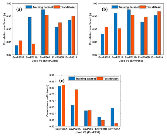 For Stung Treng, Kratie, and Tan Chau, the best results obtained from the training and validation datasets were from the combinations EnvP565A–021B, EnvP021A–565B, and EnvP866–952, respectively. However, there exists a possibility that the VS combination of the best from the test dataset (January 2007 to October 2010) might be different from that of the training and validation datasets due to different patterns in the variation of H in the training/validation and test datasets [45]. Since we used the parameters of ELQ obtained from the training dataset, it is advantageous to use the test dataset with a similar pattern to the training dataset. Additionally, the correlation coefficient () between two base learners ( and ) should be small in order to maximize the performance of ELQ [14]. To analyze the best combination of VSs for the test dataset, a comparison of obtained from Envisat-derived H between the training and test datasets was performed as shown in Figure 8. For Stung Treng, the best base learner was obtained from EnvP021B (see Table 6). In order to select the best combination with EnvP021B, should be small as much as possible in both the training and test datasets. Since obtained from H between EnvP565A and EnvP021B was the smallest, the combination EnvP565A–021B was selected for the test dataset for ELQ. Similarly, the combinations EnvP866–EnvP565A and EnvP866–EnvP952 were selected for the test dataset of ELQ for Kratie (Figure 8b) and Tan Chau (Figure 8c), respectively.
