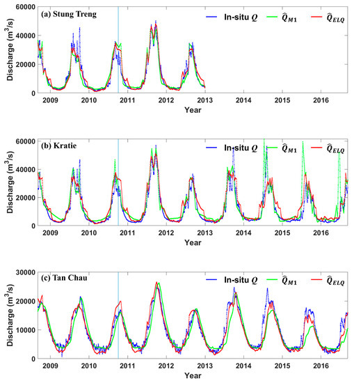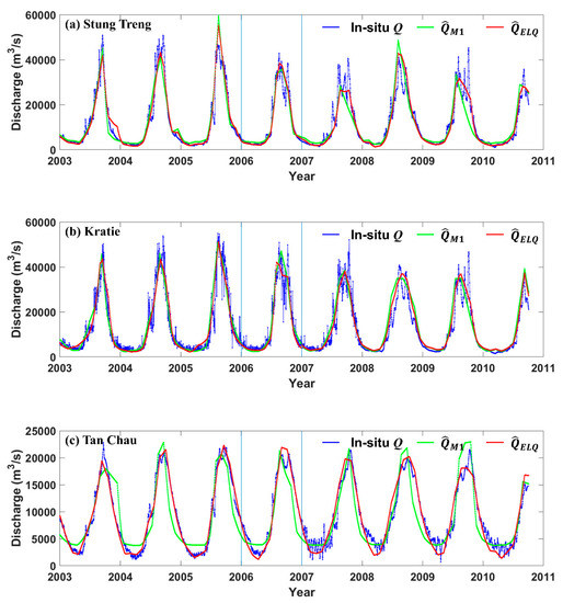 Table 7 compares the performance of and for the three in-situ Q stations according to the four metrics with the test dataset. Similar to the results from the training and validation datasets, outperformed for all three locations. It should be noted that in-situ water levels at Tan Chau were used for generating pseudo-in-situ Q for statistics in Table 6 since in-situ Q at Tan Chau does not exist for the test period. Hydrographs for the training and validation datasets are shown in Figure 9. In the case of Stung Treng and Kratie, and showed a similar pattern. However, were inaccurate in the high-water season of 2009. These inaccurate might be attributed to the test dataset, which has a different H pattern compared to the training dataset [46]. In other words, the fluctuating Q pattern in the high-water season of 2009 might affect the performance of whereas showed a better fit to in-situ Q because ELQ combines two base learners. In the case of Tan Chau, outperformed since the pattern of Q at Tan Chau is affected by TSL and the Mekong mainstem [18].