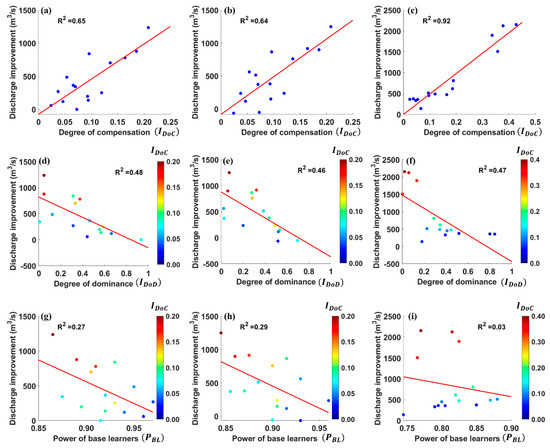Thirdly, Kim et al. [17] also introduced another performance index for ELQ termed power of base learner (), which is calculated by averaging the NSEs of base learners. In order to investigate the relationship with Q improvement, , and , each result was color-coded with , as shown in Figure 11g–i. In contrast to the results in [17], which showed a positive relationship between Q improvement and , these two showed a negative relationship for Stung Treng, Kratie, and Tan Chau. The reason for this negative relationship is likely due to a greater from the LMRB. In other words, although more base learners were added in the ELQ process, no improvement in Q estimation was made when the performance of each base learner was high enough (e.g., NSE > 0.90). On the other hand, the values with higher Q improvement (e.g., reddish dots in Figure 11i) showed relatively low . This demonstrates that Q improvement becomes maximized when relatively weak base learners are integrated [40].