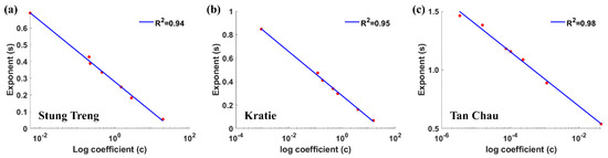 Relationship between log at-a-station hydraulic geometry (AHG) coefficient and AHG exponent in the power law relationship () from (a) Stung Treng, (b) Kratie, and (c) Tan Chau.
