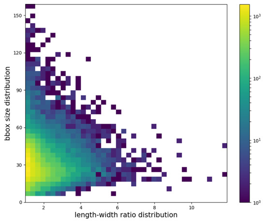 The SAR ship detection dataset used in this paper is of multi-resolution, and different types of ships have different sizes, so that the ship in the chips has various sizes. In addition, the SAR images are affected by the imaging mode, and the geometric deformation caused by the incidence angle will also result in the change of the ship shape in chips. Here, we use the multi-layer feature maps for ship detection, and we need to design the multiple anchor sizes for the SAR ship detection dataset. We count the distribution of the bounding box size in the dataset and take into account the comprehensive size and the aspect ratio of the bounding box. Taking as the horizontal axis and as the vertical axis, we locate each bounding box in a two-dimensional coordinate graph, so as to have a comprehensive understanding of the distribution of the bounding box size. Here, and are the lengths of the long side and the short side of each bounding box. The result is shown in Figure 5.