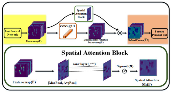 Basically, 1 × 1 convolution has two main functions. One is to realize the cross-channel interaction and information integration of feature maps in different channels, so as to improve the expression ability of the network. The second is to reduce or increase the number of feature map channels, so as to increase the nonlinearity of CNNs and facilitate the optimization of network structure. The 1 × 1 convolution simply maps the values at the same location of all channels to one value, without considering the spatial information along the W/H dimension of the feature maps. For the purpose of enlarging the receptive field of 1 × 1 convolution, Inception adds 3 × 3 and 5 × 5 convolution in parallel to obtain the receptive field of different sizes and extract the features on different scale. However, the increase of the network width results in the degradation of the network computational performance. In order not to significantly increase the computational complexity, we embed SAB in FPN to enhance the spatial information on the feature maps [48,49]. SAB infers a 2D spatial attention map and refines the feature maps of the feedforward network. By multiplying the spatial attention map and the feature maps with channel reduced by 1 × 1 convolution, the feature maps refined on spatial-wise will obtained. The location and specific implementation process of SAB are shown in Figure 7.