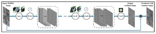 Figure 2 illustrates the network architecture. It takes interpolated MODIS images as input and exports the image details. D convolutional layers and D-1 nonlinear layers are contained in the network, where each convolutional layer except for the last one is followed by an ReLU layer. The first layer operates on the input image with 64 3 × 3 filters. The layers from 2 to D-1 contain 64 3 × 3 filters, where each layer operates on 3 × 3 spatial region across 64 channels. The last layer contains a single 3 × 3 × 64 filter to yield the output residual images.