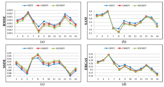 Table 2 and Table 3 list the quantitative results in terms of RMSE, SAM, SSIM, and ERGAS of the fusion results shown by Figure 8 and Figure 9. We can observe that the fusion result of VDCNSTF was better than the fusion result of SRSTF and CNNSTF on all bands, which indicated that VDCNSTF achieved better spatial and spectral prediction results than comparison methods.