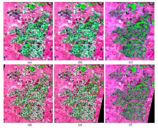 Figure 7. Illustrating image-pairs of LGC. (ac) are MODIS data on the 7th, 8th, and 9th dates, respectively, and (df) are the Landsat data on the same dates as MODIS.