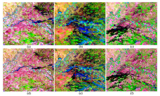 Figure 6. Illustrating image-pairs of CIA. (ac) are MODIS data on the 7th, 8th, and 9th dates, respectively; (df) are the Landsat data on the same dates as MODIS.