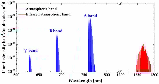 Molecular oxygen absorbs radiation in its two lowest-lying electronic transitions: at 1.27 µm (the infrared atmospheric band) and with bands at 762, 688, and 629 nm, which are referred to as the A, B, and γ atmospheric bands. The absorption line strength and spectral distribution of the four bands are shown in Figure 1. The B () and γ () bands do not produce airglow because the excited vibrational states are quenched into the v’ = 0 state before the electronic transition takes place. Compared with the A atmospheric band, the infrared atmospheric band provides a stronger radiative signal, covers a much more extended altitude region (between ~20 and 120 km in the dayglow), and suffers less from the self-absorption of O2 molecules in the ground state.