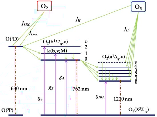 The key to accurate calculation of the limb spectral radiance of the O2 infrared atmospheric band depends not only on an accurate knowledge of the atmospheric and spectroscopic parameters but also on a detailed accounting of all sources of O2(a1Δg) [14]. Remote sensing of airglow emissions has contributed significantly to the current understanding of the production and loss mechanisms of electronically excited O2(a1Δg). The metastable molecule O2(a1Δg) is formed in the processes of photodissociation of O3 and O2 by absorption of ultraviolet radiation of the sun. The first commonly accepted model of O3 and O2 photolysis was developed by Thomas (1984) [15] and Harris and Adams (1983) [16]. M.G. Mlynczak, S. Solomon, and D.S. Zaras significantly improved this model in 1993 (for the sake of brevity, this model is called MSZ) [14]. In 2011, Yankovsky et al. developed a complete model of electronic vibrational kinetics of O2 and O3 photolysis products (YM2011) [17,18]. In 2017, Martyshenko and Yankovsky solved the problem of systematic overestimation in the retrieve of ozone concentrations by taking the electronic vibrational kinetics of photolysis products of ozone and molecular oxygen and into the scheme of electronic vibrational kinetics of the products of O3 and O2 photolysis [19]. Figure 2 shows the dayglow production mechanism of the O2 infrared atmospheric band [20].